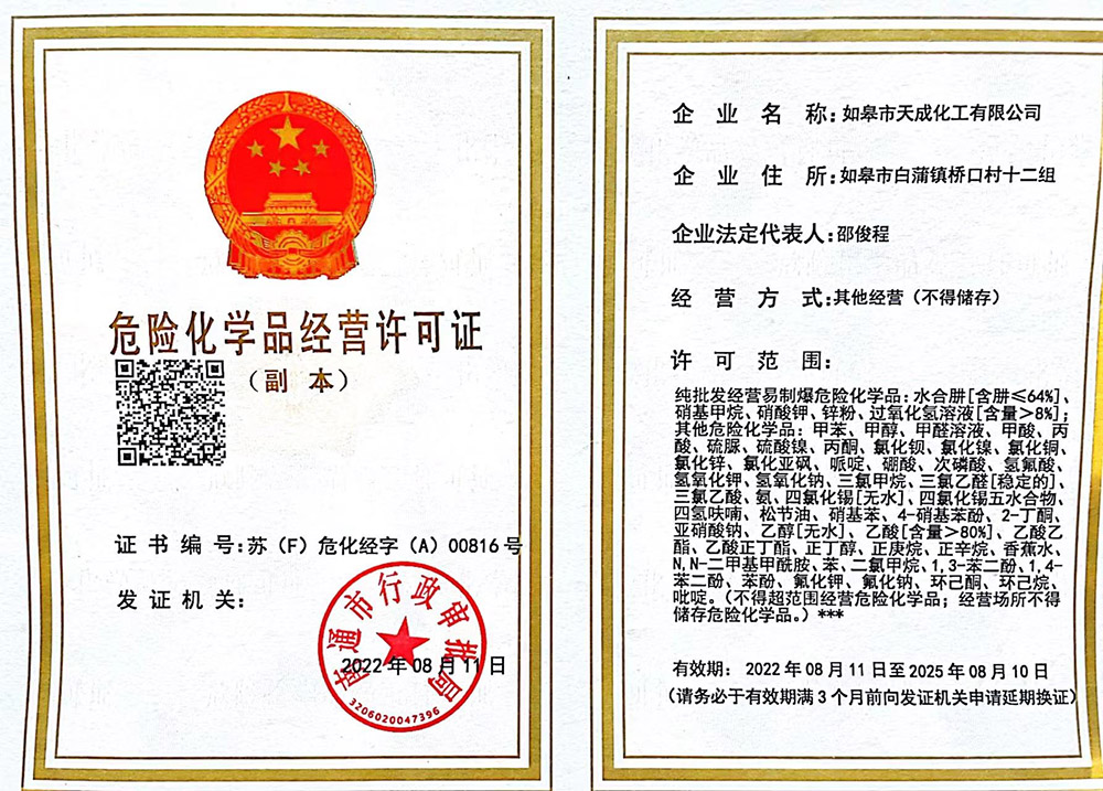 ? 如皋市天成化工有限公司創(chuàng)建于1996年。公司地處于美麗富饒的長(zhǎng)江三角洲,座落在古鎮(zhèn)林梓,通揚(yáng)運(yùn)河河畔。南瀕長(zhǎng)江、西臨204國(guó)道,距南通港、飛機(jī)場(chǎng)30公里,立體交通發(fā)達(dá)。公司經(jīng)營(yíng)管理規(guī)范,技術(shù)力量雄厚,擁有一批高、中級(jí)專業(yè)技術(shù)人才。